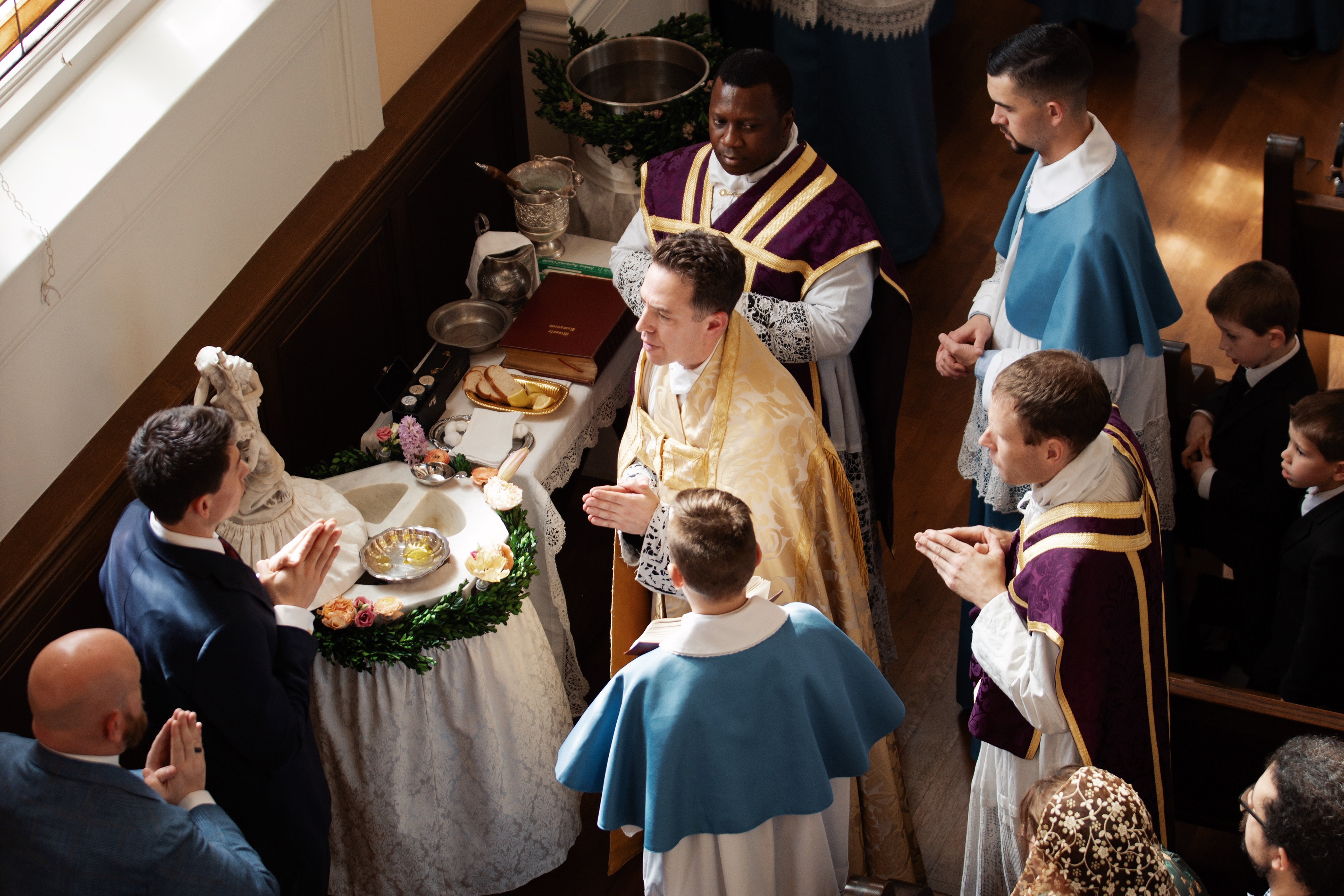 *Photography Note: The following photos were shot from over the choir loft balcony. I spoke with the rector before the liturgy and was planning on standing on the floor with a window between the servers and the font. As it was, my view was completely obstructed and I had to change my plans on the fly. Providence knows best, and the overhead photos offer a much better view of the ceremonies than photos taken from the nave would have.